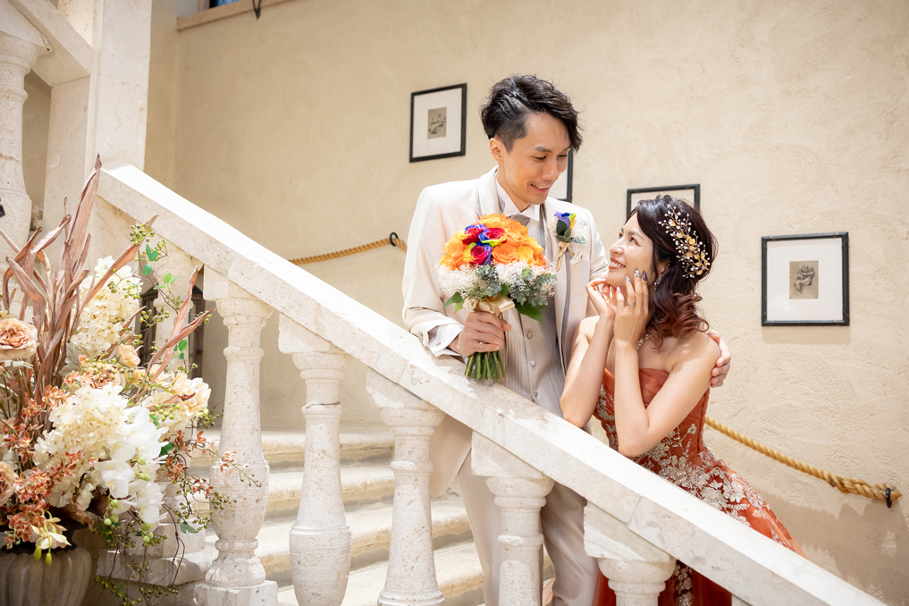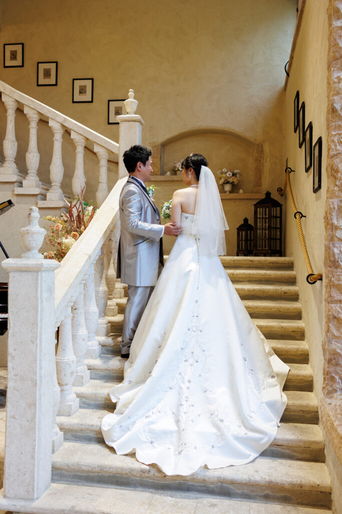 階段にドレスを流してのバックショットやエスコートをして階段を上っているショット…
