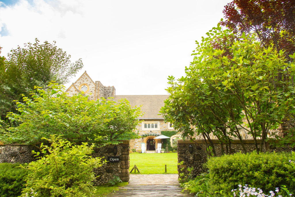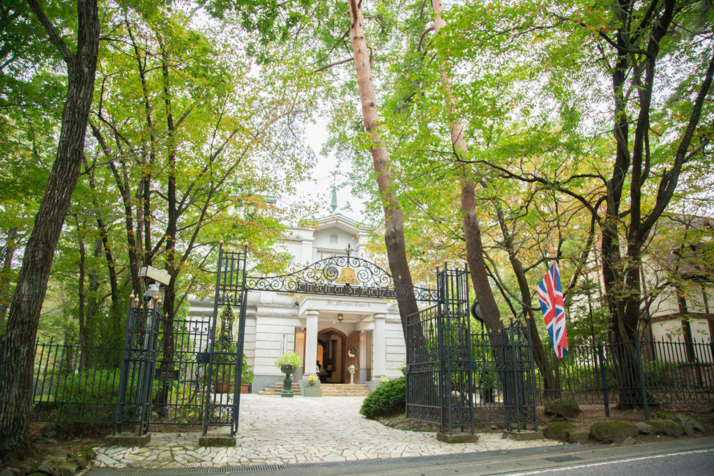 緑に囲まれた黒門と奥に見える教会がとても素敵です✨