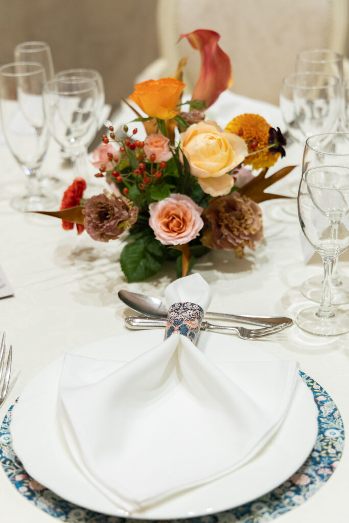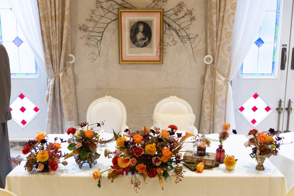 会場は全体的に白い色味で、赤&オレンジ系の落ち着いた暖色を際立たせました💐