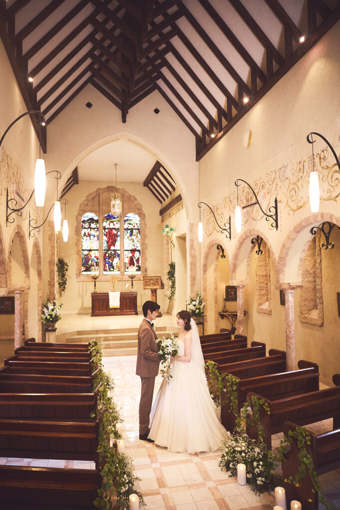 礼拝堂内はアイボリーとピンクで、あたたかな雰囲気です。
