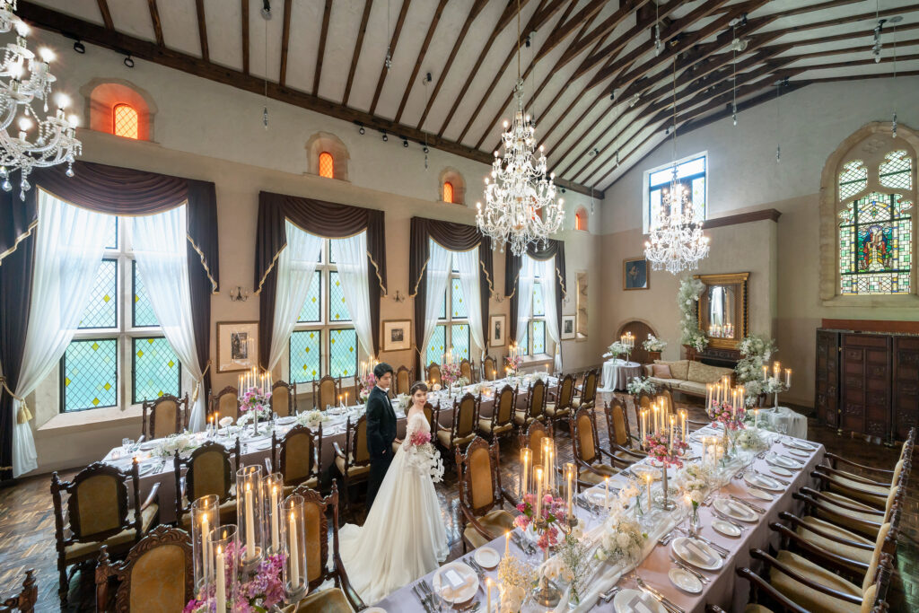 高い天井にシャンデリアが煌めき晩餐会を繰り広げていたような空間が魅力