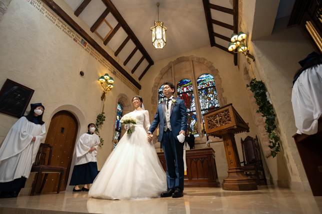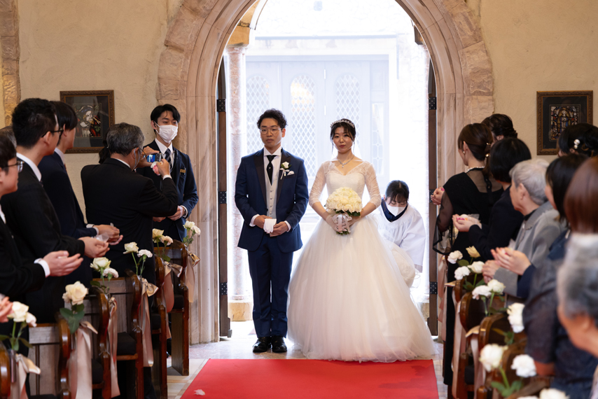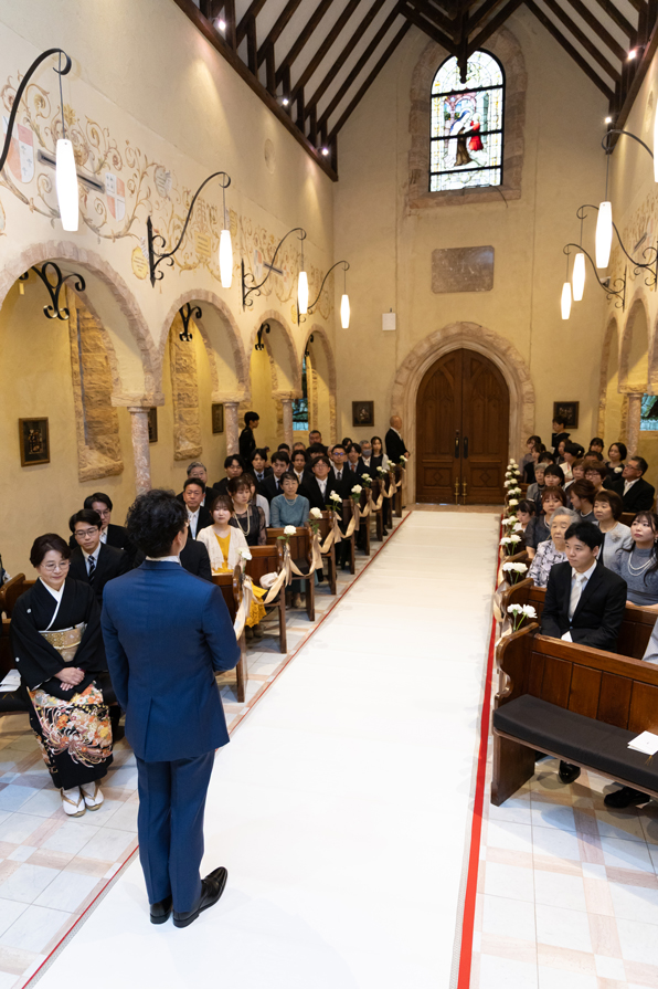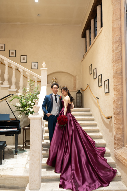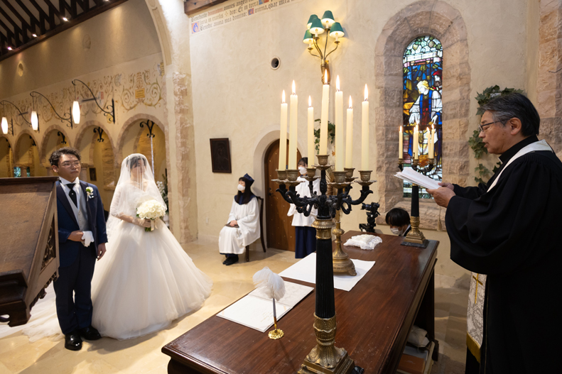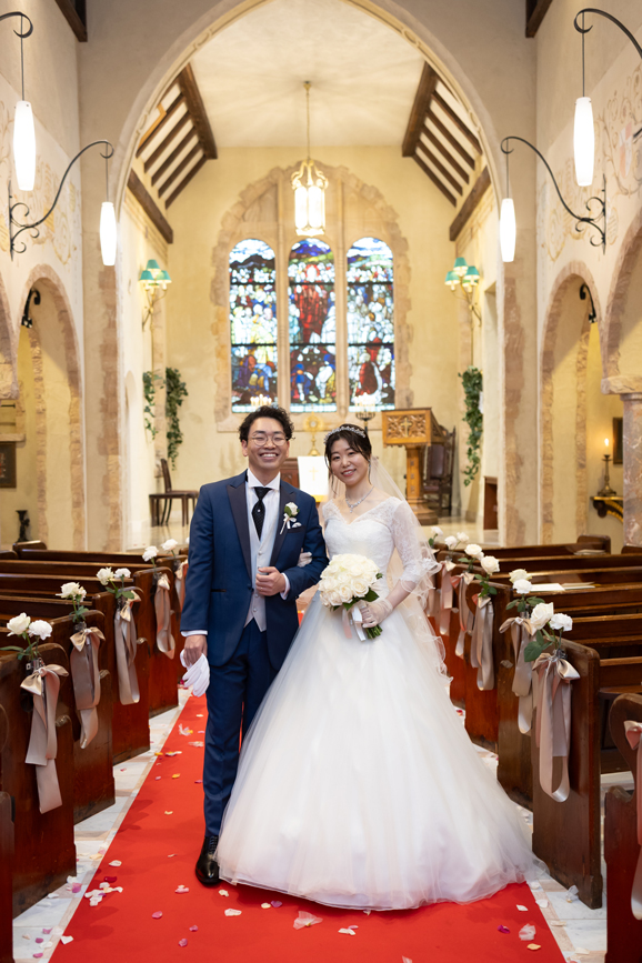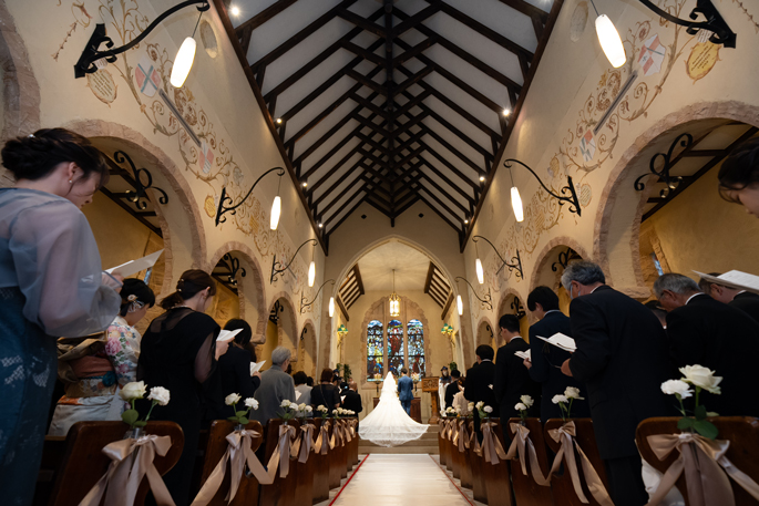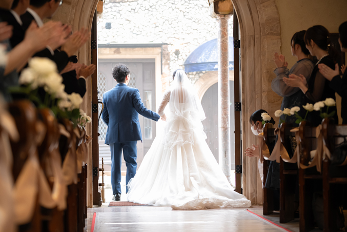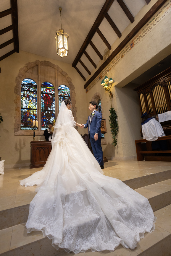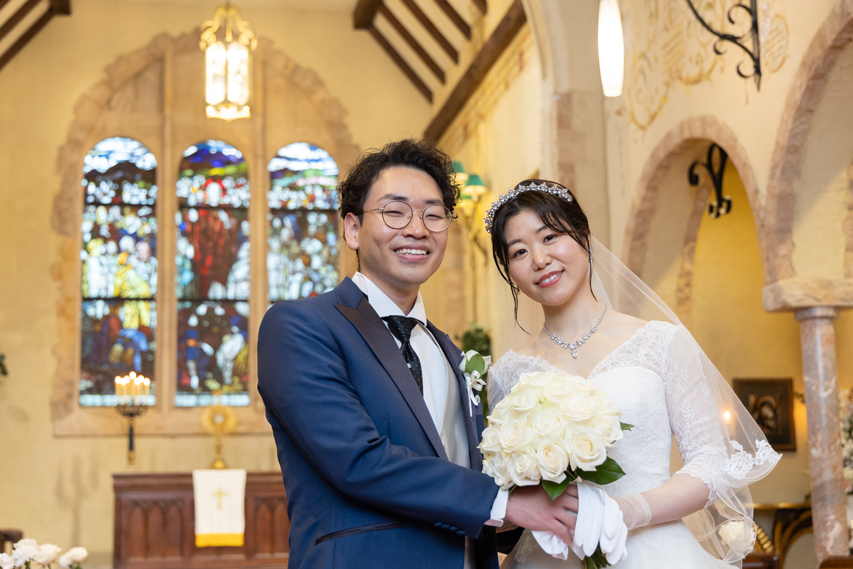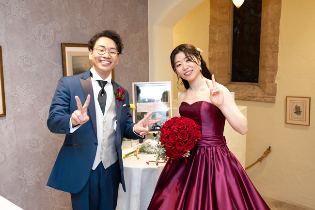付き合いたての時にステンドグラス美術館を訪れ、外観に一目惚れし、ここで結婚式を挙げたいと思ったから。